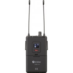 · Le système sans fil UHF de retour casque intra-auriculaire Prodipe IEM5120 est un ensemble émetteur et récepteur audio avec des composants de haute qualité destinés à assurer la liaison entre la source audio (console de retour, son façade, bande son...) et vos oreilles, par l'intermédiaire du casque Prodipe connecté au bodypack récepteur.